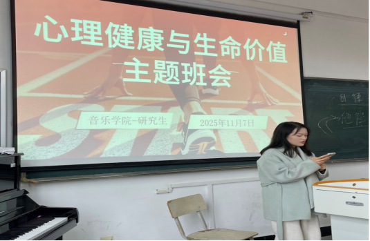 为深入落实“时代新人铸魂工程”要求,帮助研究生树立正确生命观、价值观,11月7日中午13时,安庆师范大学学科教学(音乐)专业在艺术楼B206教室举办“以乐悟生,向阳而行”生命价值教育主题班会,全体研究生齐聚一堂,在音乐浸润与思想碰撞中探寻生命真谛。